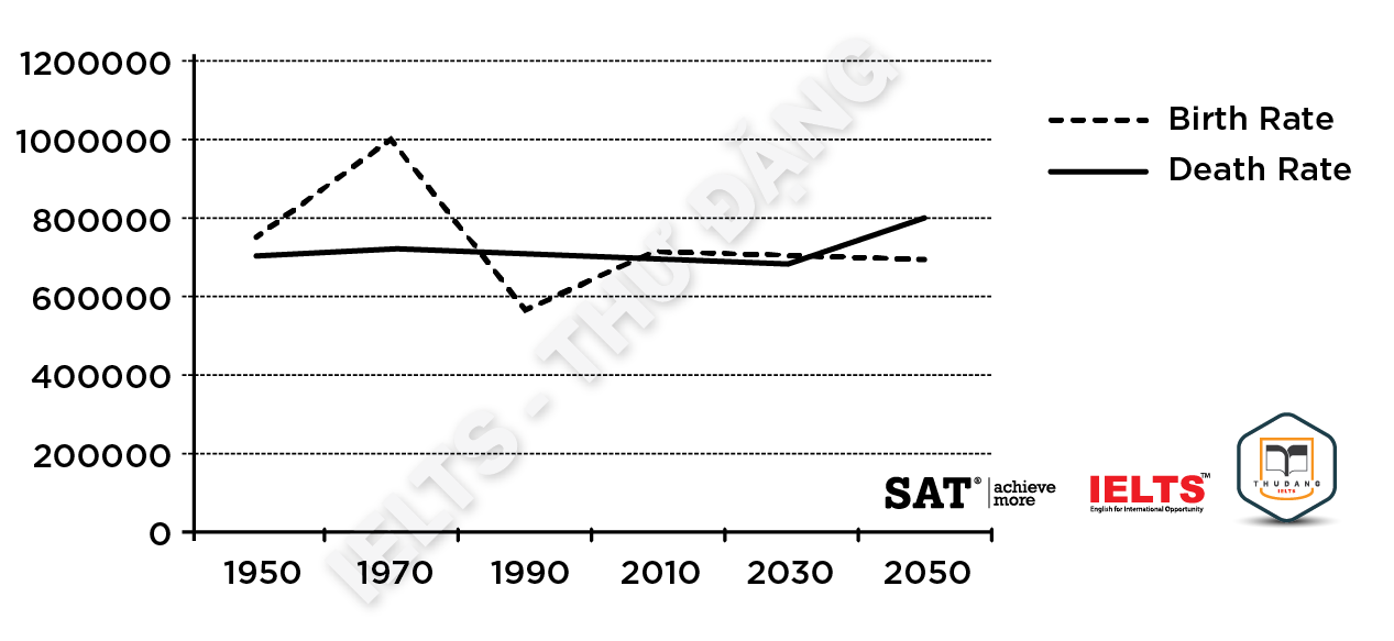 Task 1: The graph below shows the total births and the deaths in a European country from 1950 to 2050. Summarize the information by selecting and reporting the main features and make comparisons where relevant.