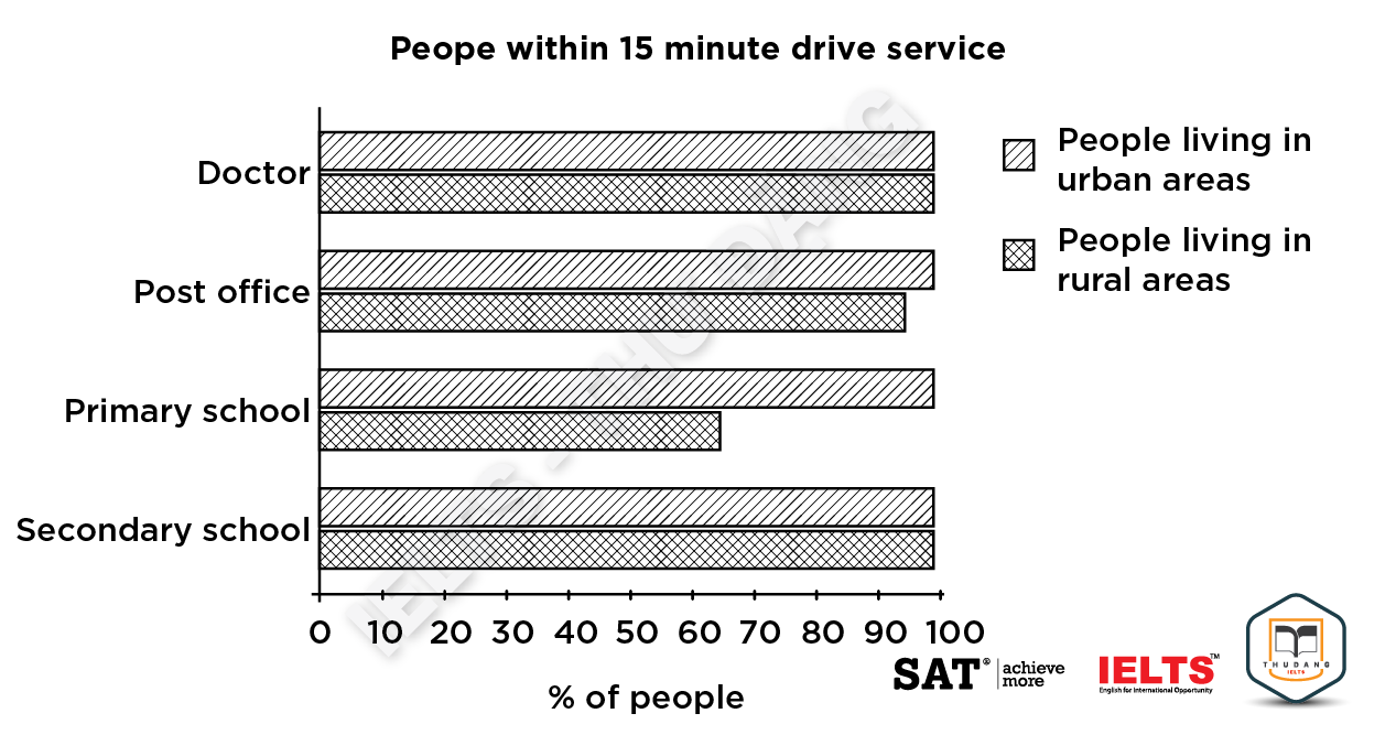 Task 1: The chart shows the information relating to people within 15-minute drive service in a particular region in the UK. It also compares the people living in urban areas and people living in rural areas. Summarize the information by selecting and reporting the main features and make comparisons where relevant.