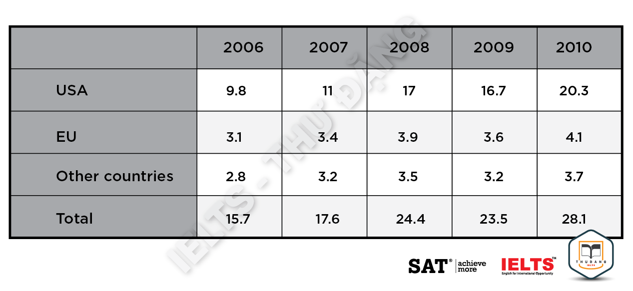 Task 1: The table shows the amount of money given to developing countries by the USA, EU countries and other countries from 2006 to 2010. (Figures are in millions of dollars). Summarize the information by selecting and reporting the main features and make comparisons where relevant.