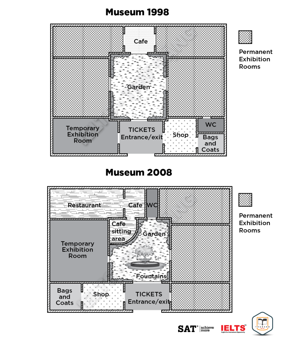 Task 1: The picture below shows the plan of a museum in 1998 and after some changes were made in 2008. Summarize the information by selecting and reporting the main features and make comparisons where relevant.