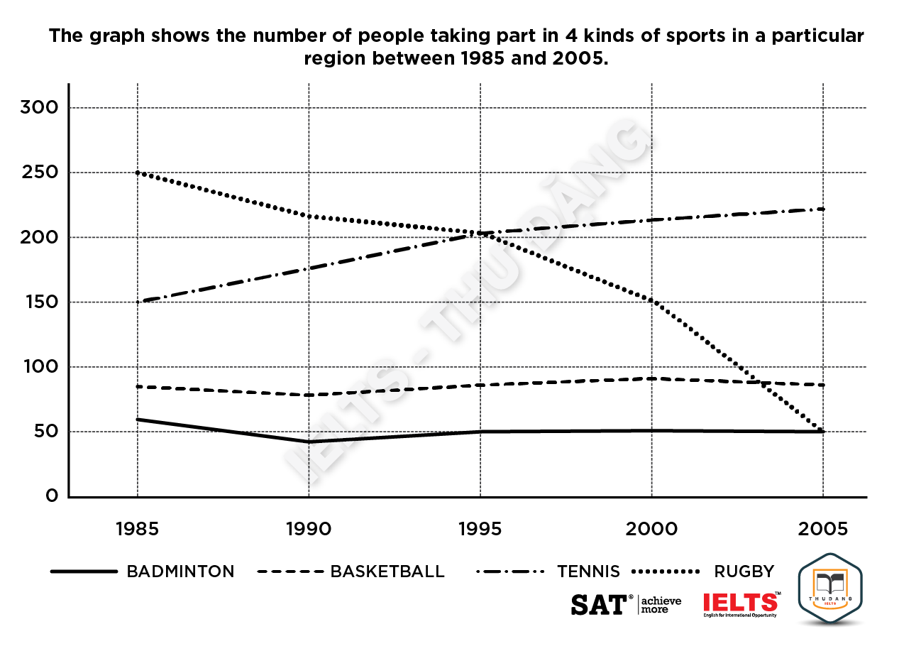 Task 1: The graph below shows the number of people taking part in 4 kinds of sports in a particular region between 1985 and 2005. Summarize the information by selecting and reporting the main features and make comparisons where relevant.