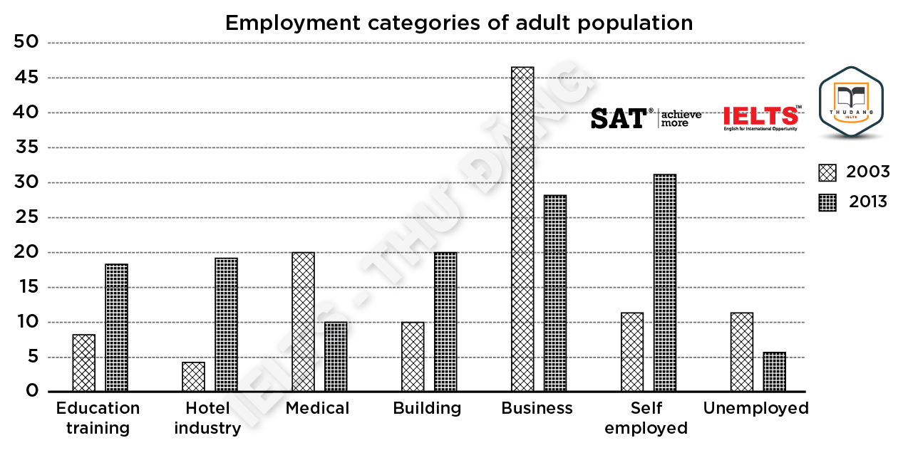 Task 1: The chart shows the employment status of adults in the US in 2003 and 2013. Summarize the information by selecting and reporting the main features and make comparisons where relevant.