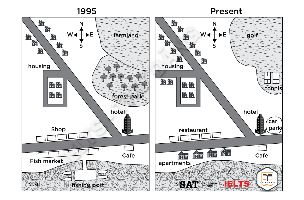 Task 1: The map below shows the development of a seaside village between 1995 and the present. Summarize the information by selecting and reporting the main features and make comparisons where relevant.