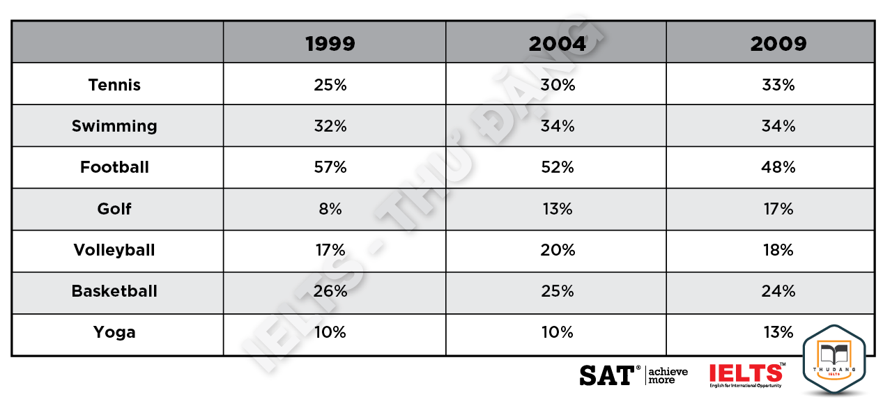 Task 1: The table below shows the change in the percentages of people joining in seven different sports in an European country from 1999 to 2009. Summarize the information by selecting and reporting the main features and make comparisons where relevant.