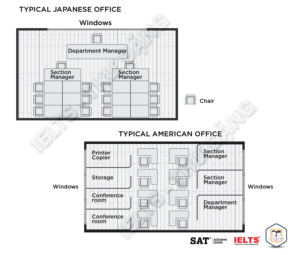 Task 1: The graph below shows a typical American and a Japanese office. Summarise the information by selecting and reporting the main features and comparisons where relevant.