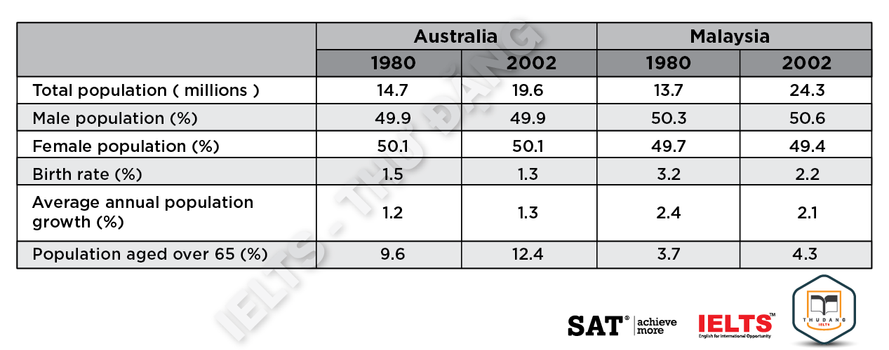 Task 1: The table below gives information about the population in Australia and Malaysia in 1980 and 2002. Summarize the information by selecting and reporting the main features and make comparisons where relevant.