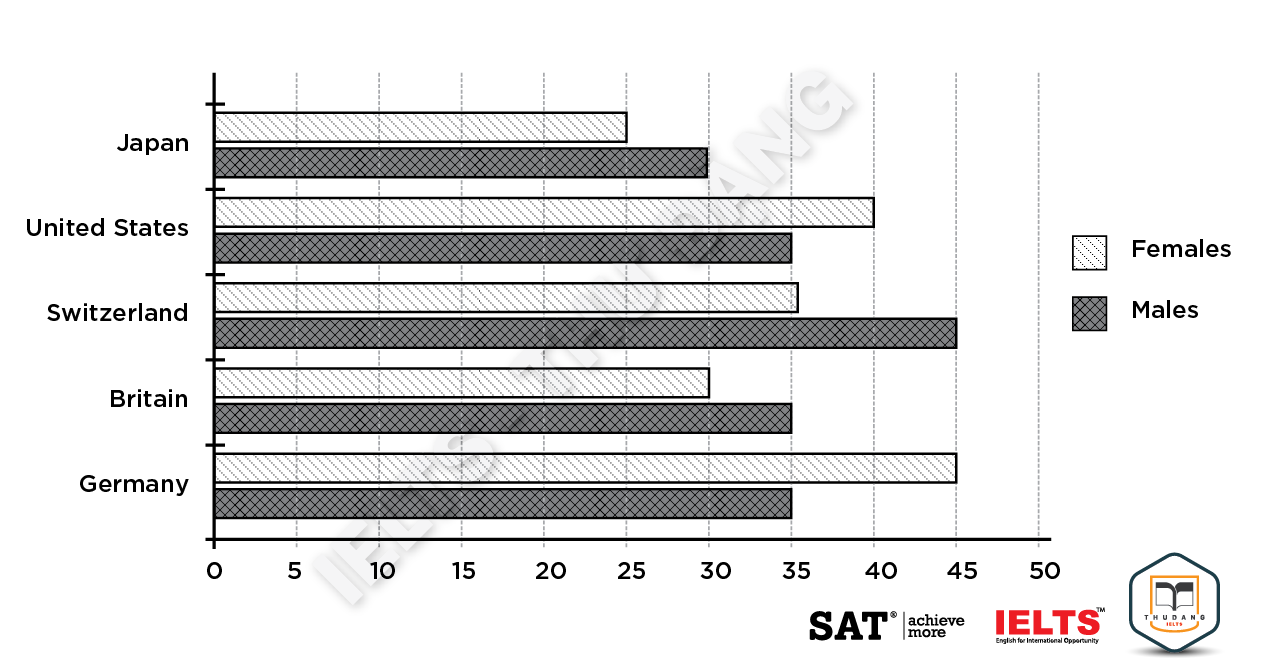 Task 1: The chart below shows the percentage of males and females with higher education qualifications in five countries in 2001. Summarize the information by selecting and reporting the main features and make comparisons where relevant.