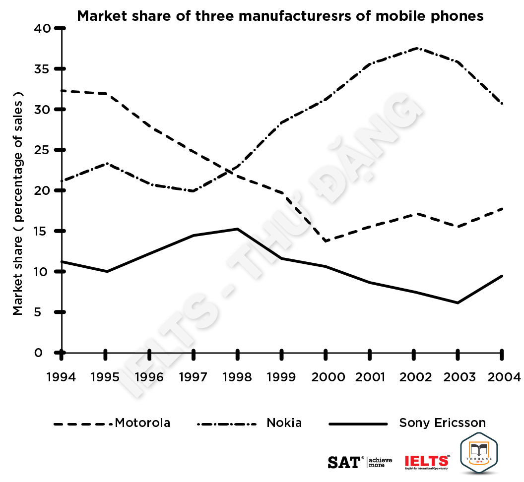 Task 1: The line graph below illustrates the proportion of mobile phone sales by three manufacturers (Motorola, Nokia and Sony Ericsson) between 1994 and 2004. Summarize the information by selecting and reporting the main features and make comparisons where relevant.