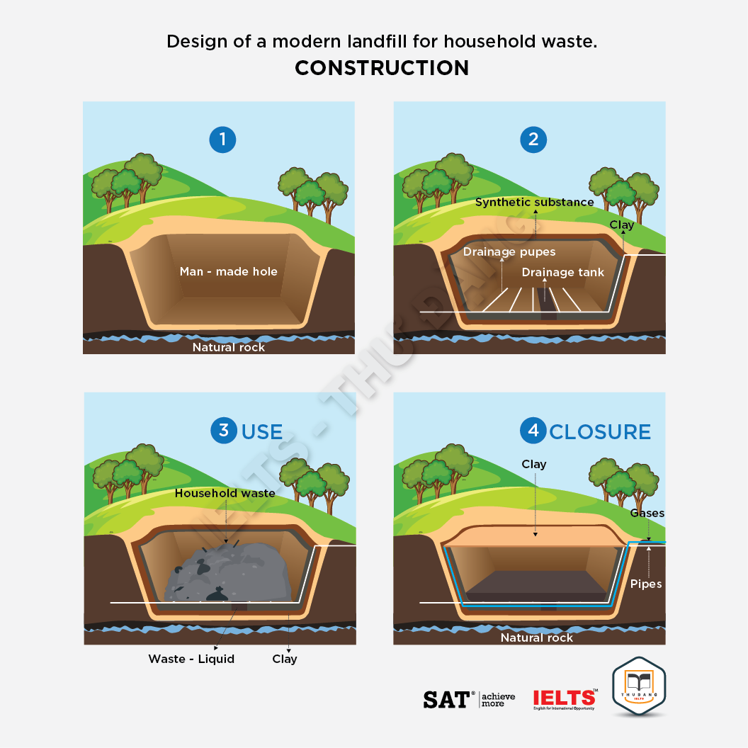 Task 1: The diagram shows the design of a modern landfill for household waste. Summarize the information by selecting and reporting the main features and make comparisons where relevant.