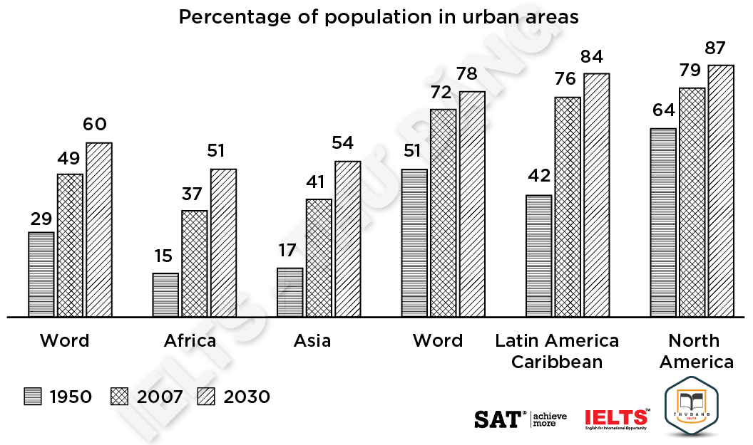 Task 1: The bar chart below gives information about the percentage of the population living in urban areas in the world and in different continents. Summarize the information by selecting and reporting the main features and make comparisons where relevant.