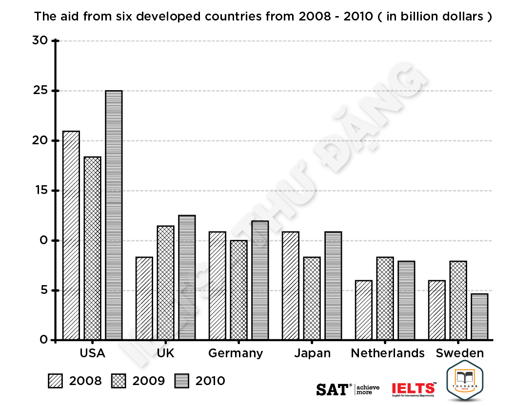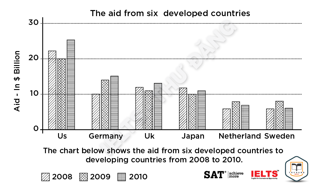 Task 1: The chart below shows the aid from six developed countries to developing countries from 2008-2010. Summarize the information by selecting and reporting the main features and make comparisons where relevant.