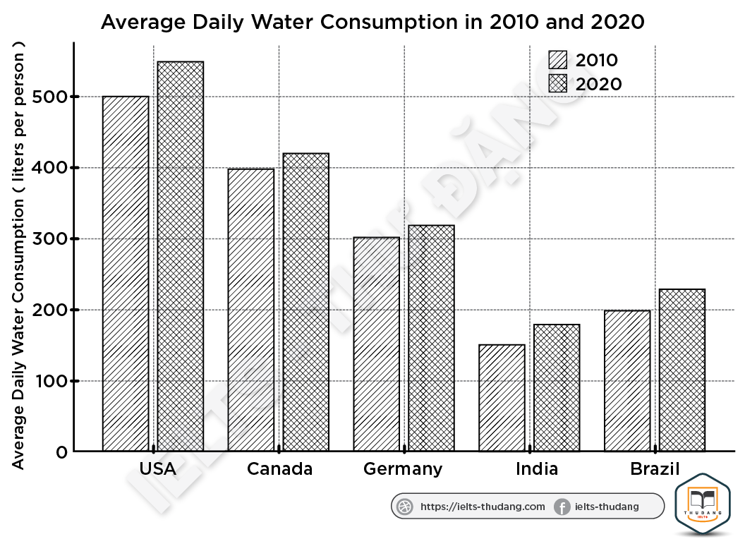 Task 1: The bar chart below illustrates the average daily water consumption (in liters) per person in five different countries in 2010 and 2020. Summarize the information by selecting and reporting the main features and make comparisons where relevant.