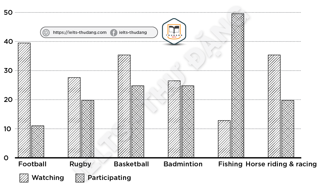 Task 1: The column graph shows the percentage of males in a particular country who prefer watching sports to males who prefer participating in sports. Summarise the information by selecting and reporting the main features and make comparisons where relevant.