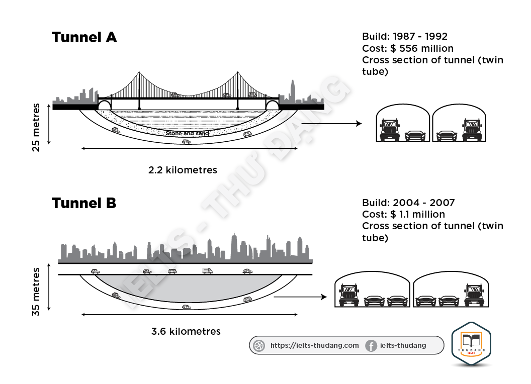 Task 1: The diagrams below give information about two road tunnels in two Australian cities. Summarize the information by selecting and reporting the main features and make comparisons where relevant.