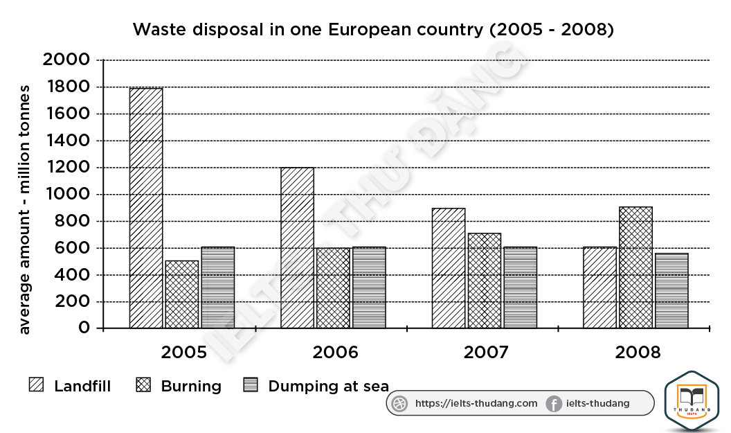 Task 1: The bar chart details the amount of waste that was disposed via landfill, burning and dumping at sea, in a particular European country between 2005 and 2008.