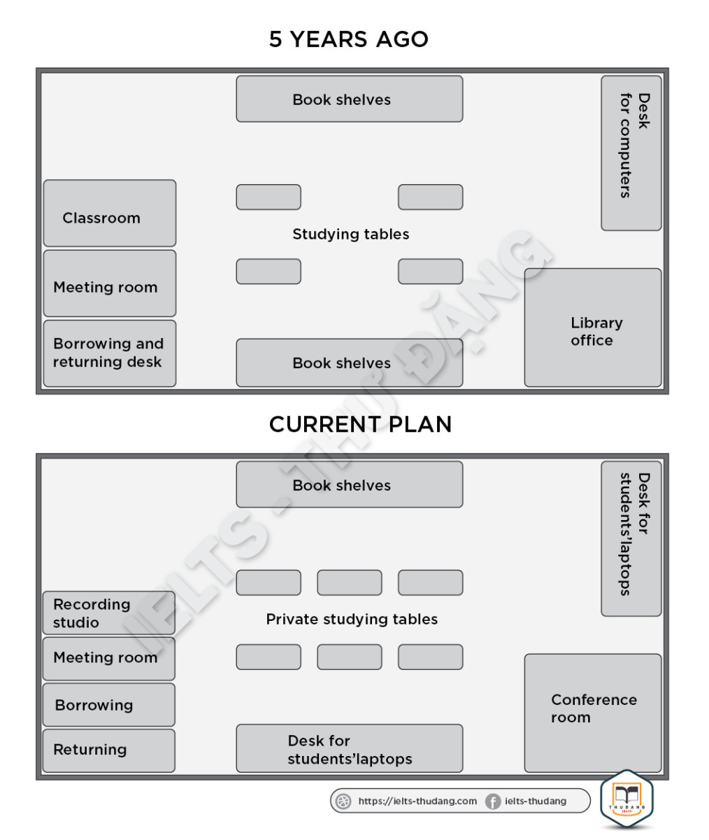 Task 1: The plans show a school library 5 years ago and the same library now. Summarize the information by selecting and reporting the main features and make comparisons where relevant.