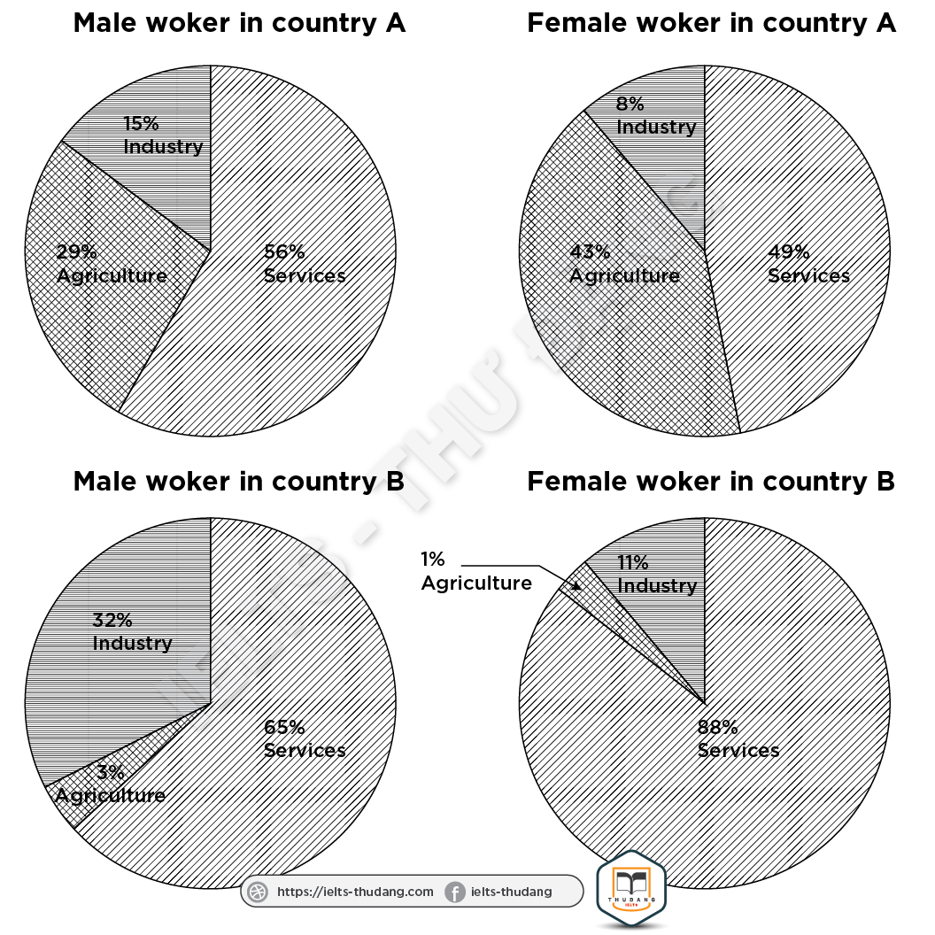 Task 1: The charts below show the percentage of male and female workers in country A and country B. Summarize the information by selecting and reporting the main features and make comparisons where relevant.