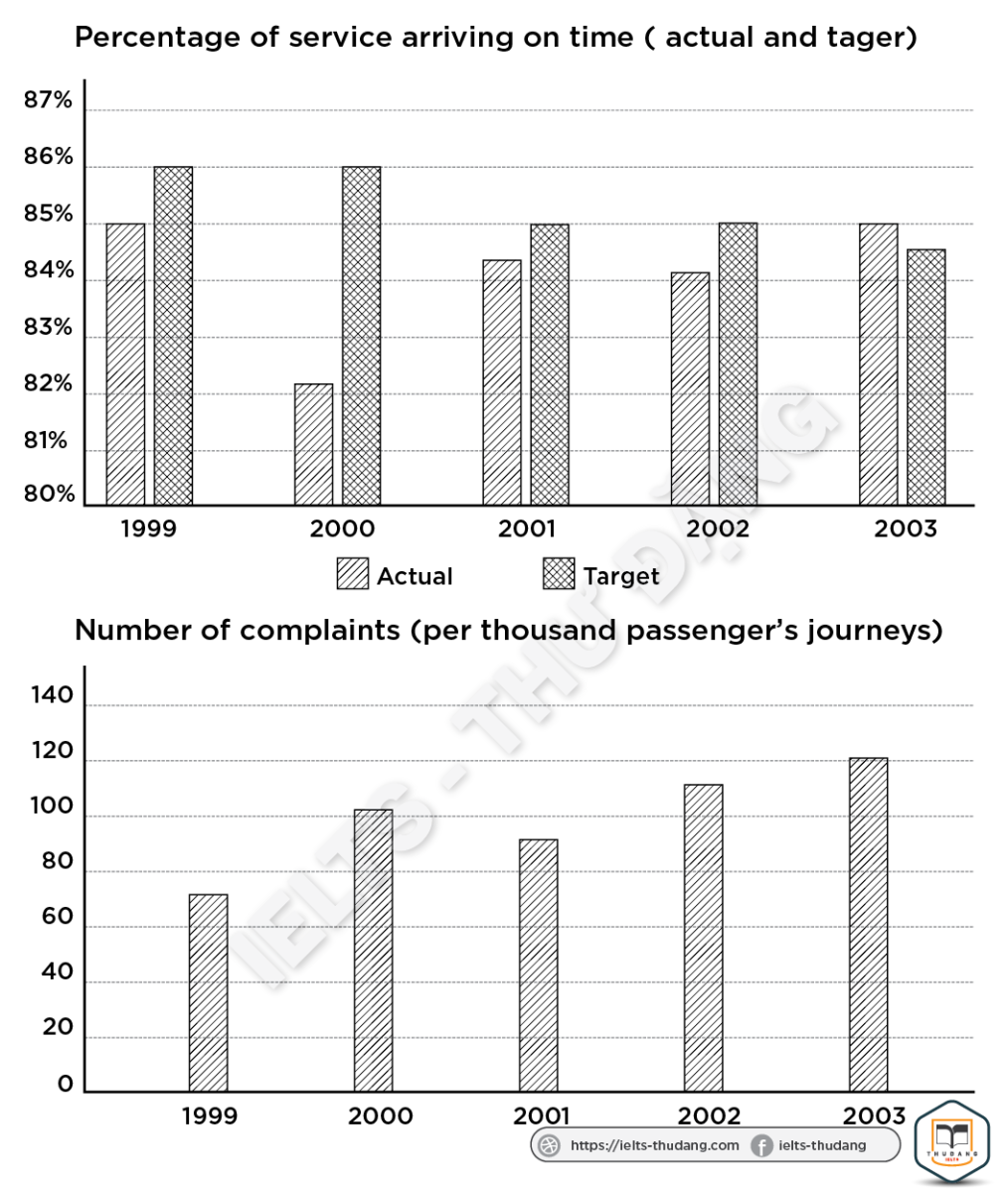 Task 1: The charts below show the performance of a bus company in terms of punctuality, both actual and target (what actually happened compared to what the company was trying to achieve), and the number of complaints and passengers. Summarize the information by selecting and reporting the main features and make comparisons where relevant.