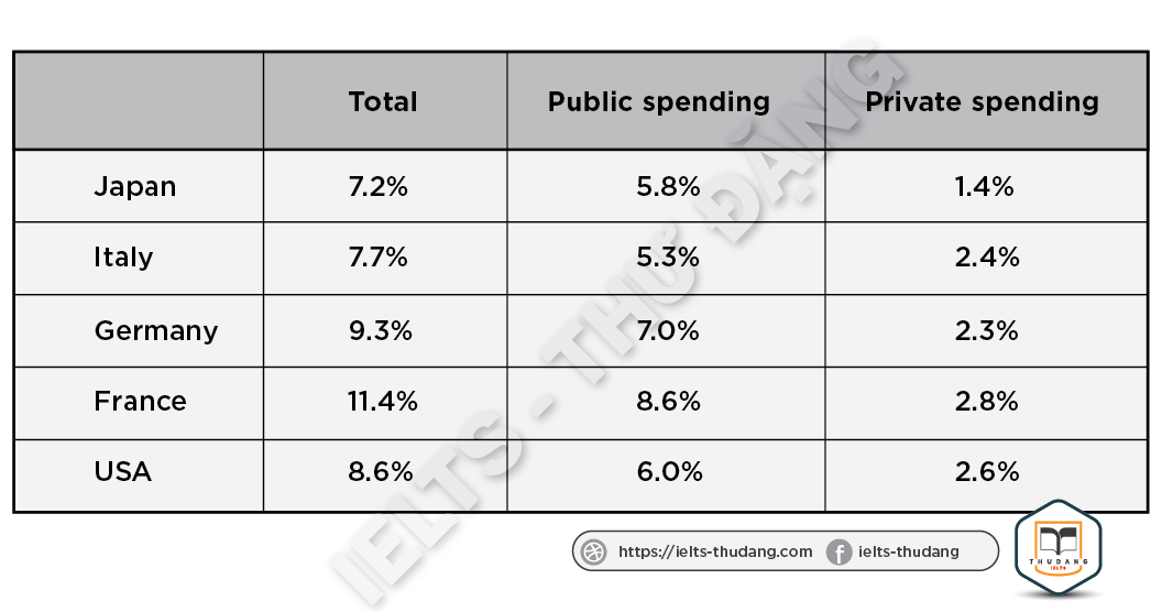 Task 1: The table below shows information about spending on health in five different countries in 2002. Summarize the information by selecting and reporting the main features and make comparisons where relevant.