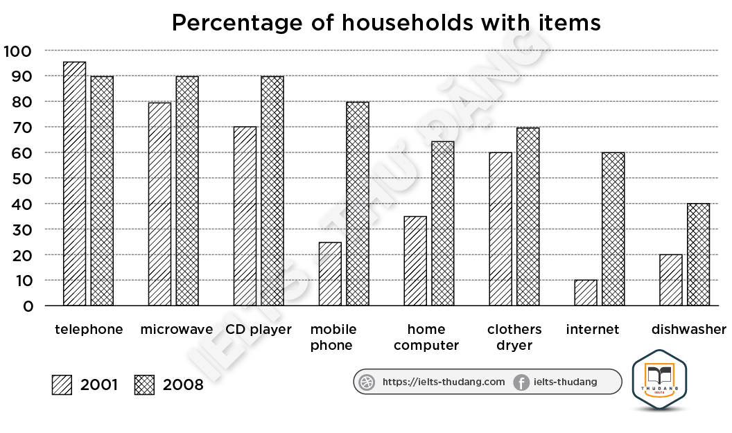 Task 1: The graph shows the percentage of households in one country that had various goods between 2001 and 2008. Summarize the information by selecting and reporting the main features and make comparisons where relevant.