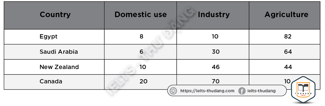 Task 1: The table below shows water use for different purposes in four countries. The use of water by four different countries (%). Summarize the information by selecting and reporting the main features and make comparisons where relevant.