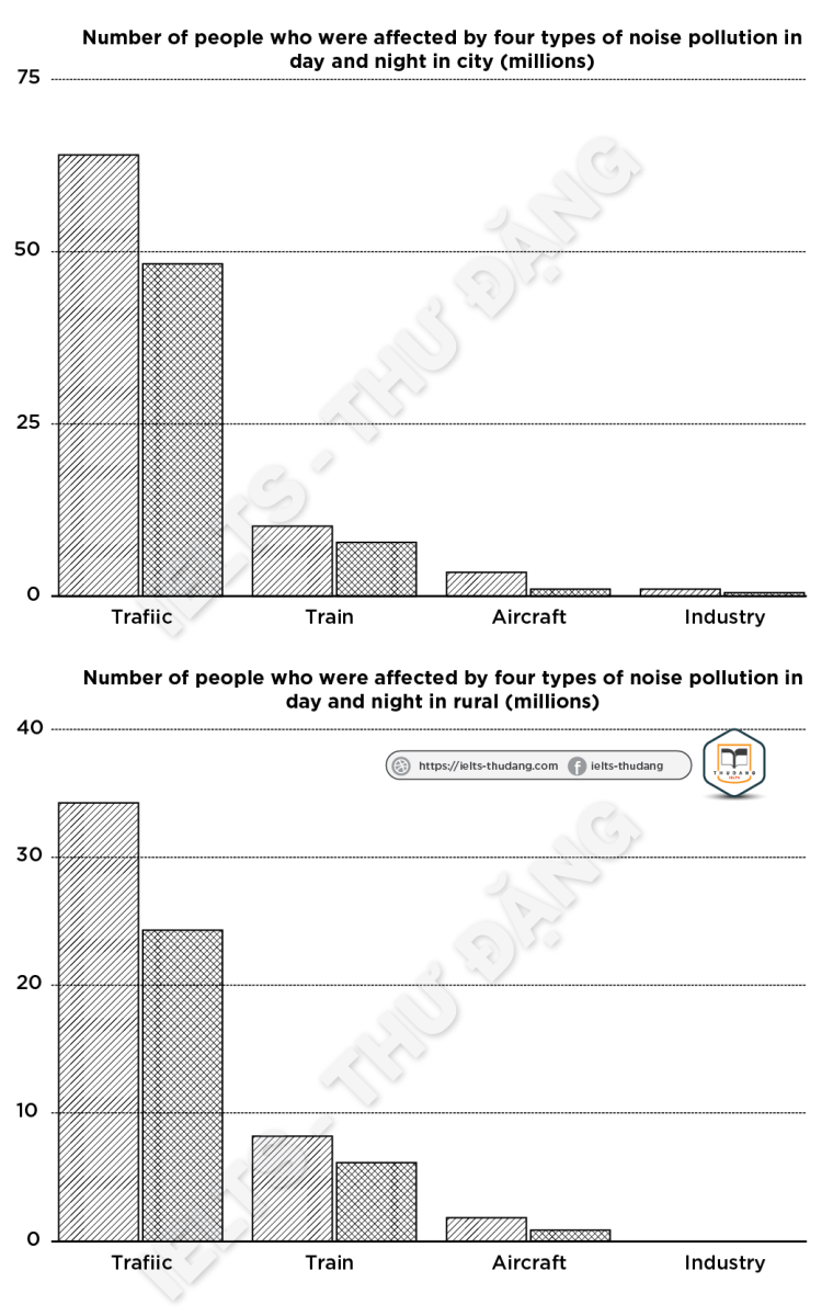 Task 1: The charts below show the number of people in Europe who were affected by four types of noise by day and by night in cities and rural areas in 2007. Summarize the information by selecting and reporting the main features and make comparisons where relevant.