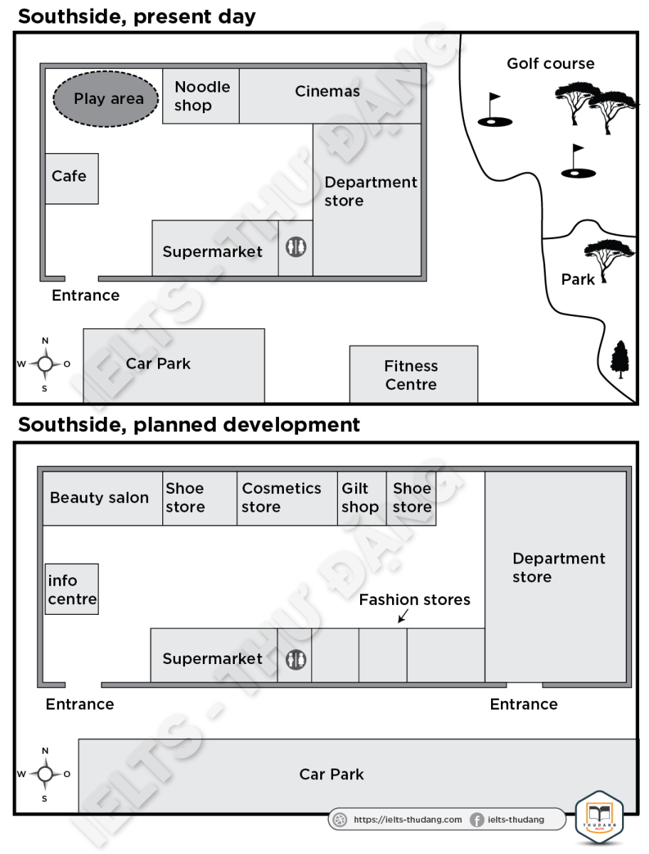 Task 1: The maps show Southside, a shopping mall, as it is now and plans for its development. Summarize the information by selecting and reporting the main features and make comparisons where relevant.