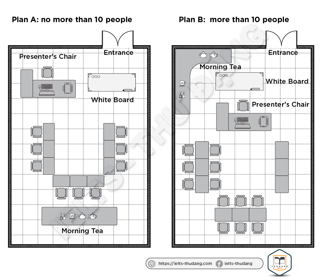 Task 1: The maps show two different plans designed for a meeting room. Summarize the information by selecting and reporting the main features and make comparisons where relevant.