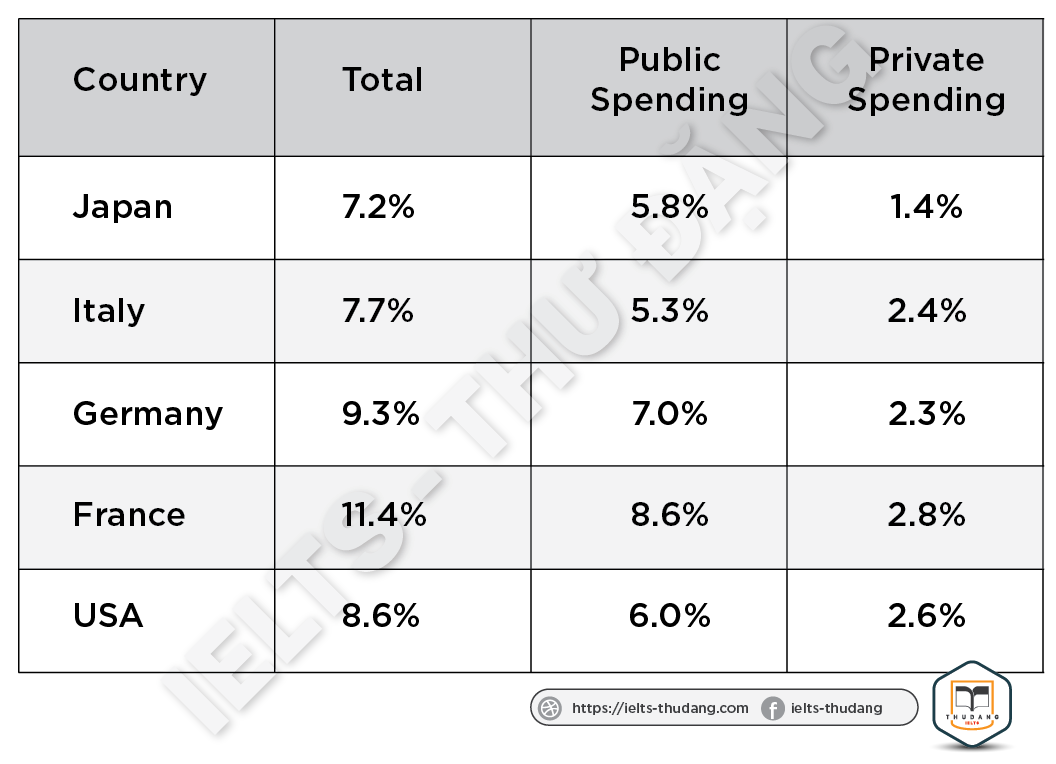 Task 1: The table shows the total percentage of GDP spent on healthcare, with a breakdown into public and private spending in five different countries. Summarize the information by selecting and reporting the main features and make comparisons where relevant.