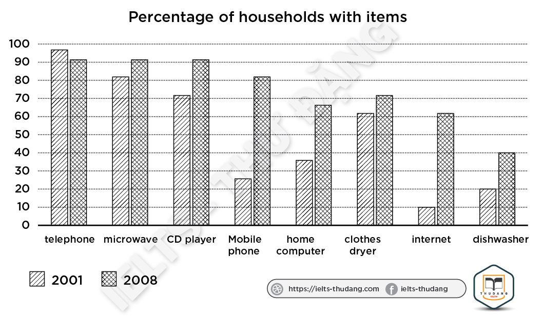 Task 1: The chart below illustrates the percentage of British households that had various items in 2001 and 2008. Summarize the information by selecting and reporting the main features and make comparisons where relevant.