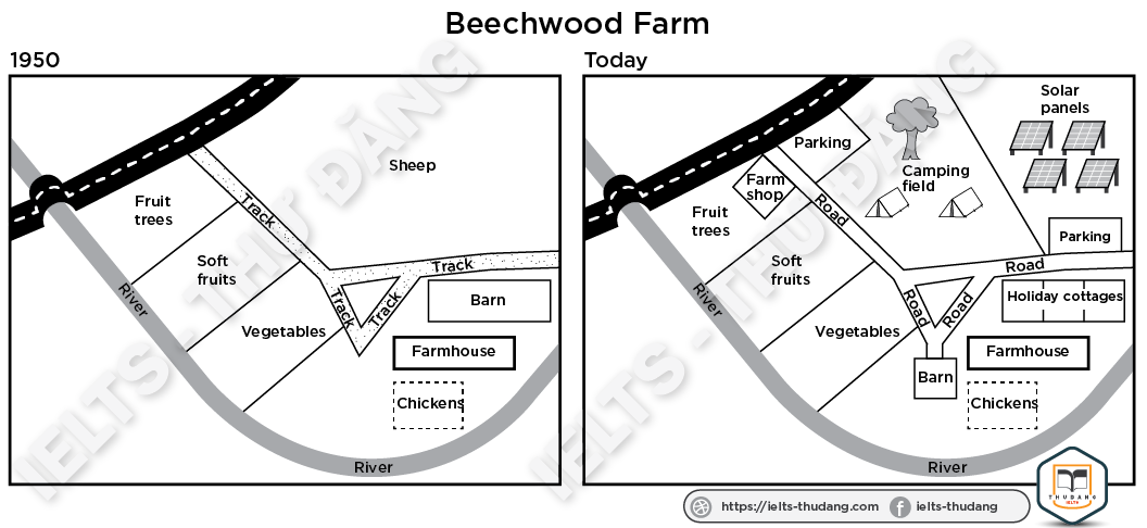 Task 1: The plans below show the site of a farm in 1950 and the same site today. Summarize the information by selecting and reporting the main features and make comparisons where relevant.
