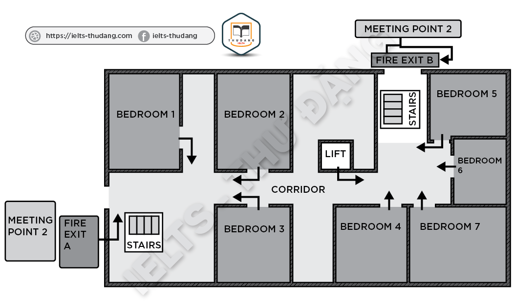 Task 1: The diagram shows the layout of part of a building, indicating the position of the fire exits. Summarize the information by selecting and reporting the main features and make comparisons where relevant.