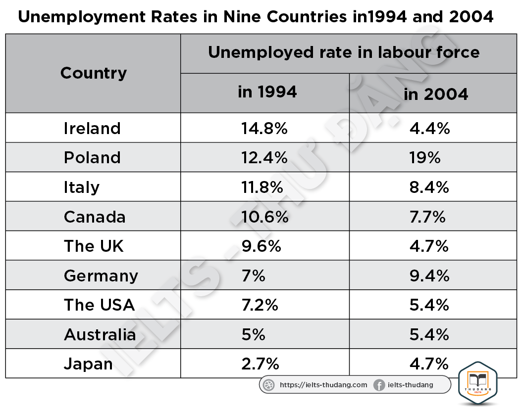 Task 1: The graph below shows the percentage of people unemployed in the total labour work force across 9 countries in 1994 and 2004. Summarize the information by selecting and reporting the main features and make comparisons where relevant.