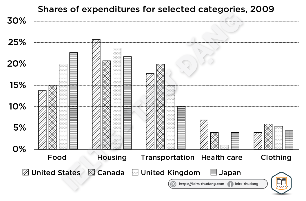 Task 1: The bar chart below shows the share of expenditures for five major categories in the United States, Canada, the United Kingdom, and Japan in the year 2009. Summarize the information by selecting and reporting the main features and make comparisons where relevant.