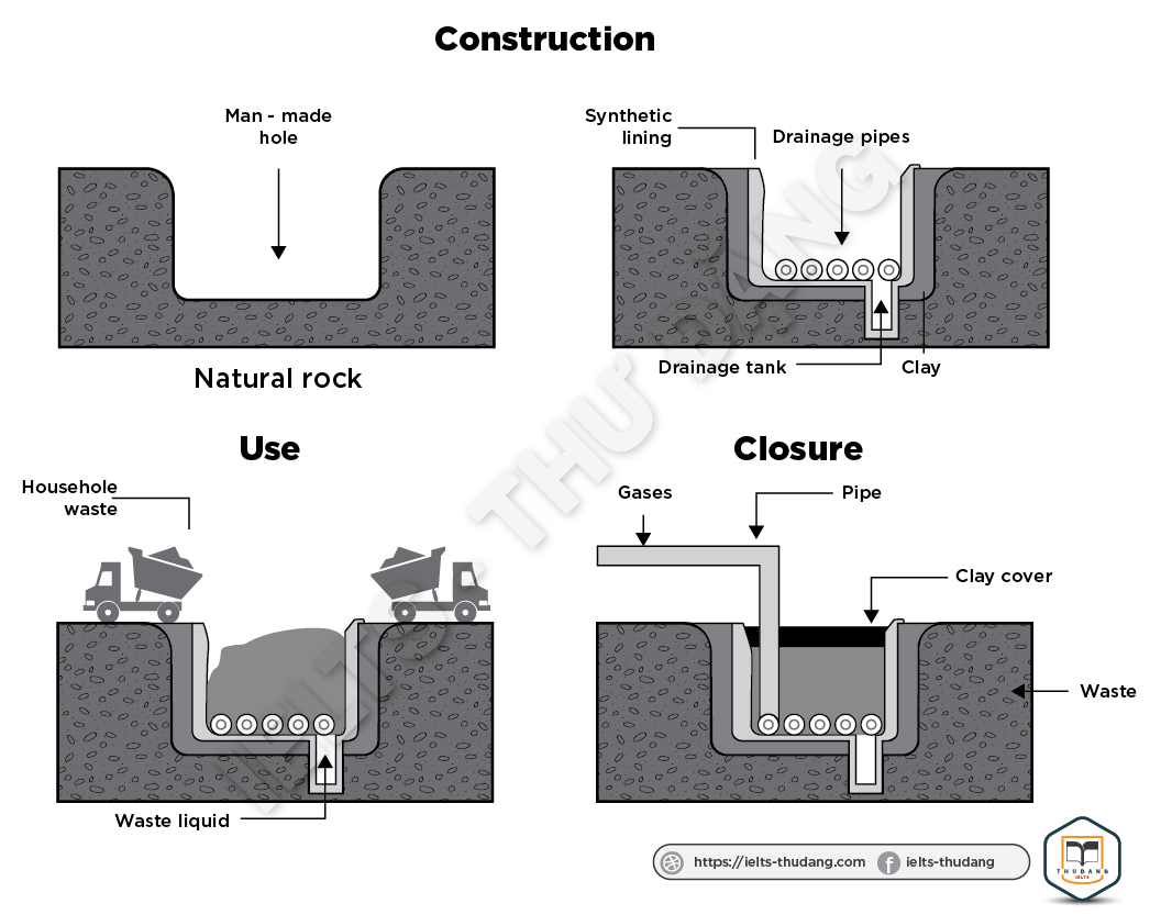 Task 1: The process shows the design of a modern landfill for household waste. Summarize the information by selecting and reporting the main features and make comparisons where relevant.
