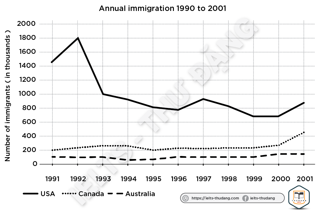 Task 1: The graph below shows the number of immigrants to these countries from 1990 to 2001. Summarize the information by selecting and reporting the main features and make comparisons where relevant.