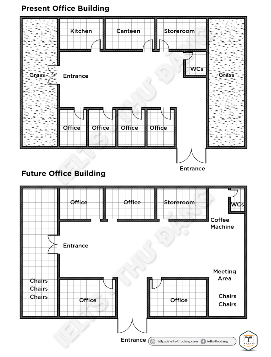Task 1: The maps show the changes of an office building between the present and the future. Summarize the information by selecting and reporting the main features and make comparisons where relevant.