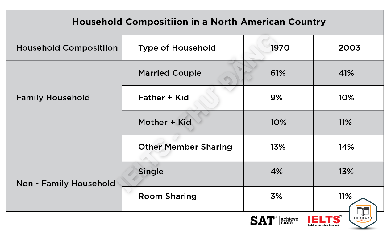 Task 1: The table below shows the household composition in a North American country from 1970 and 2003. Summarize the information by selecting and reporting the main features and make comparisons where relevant.