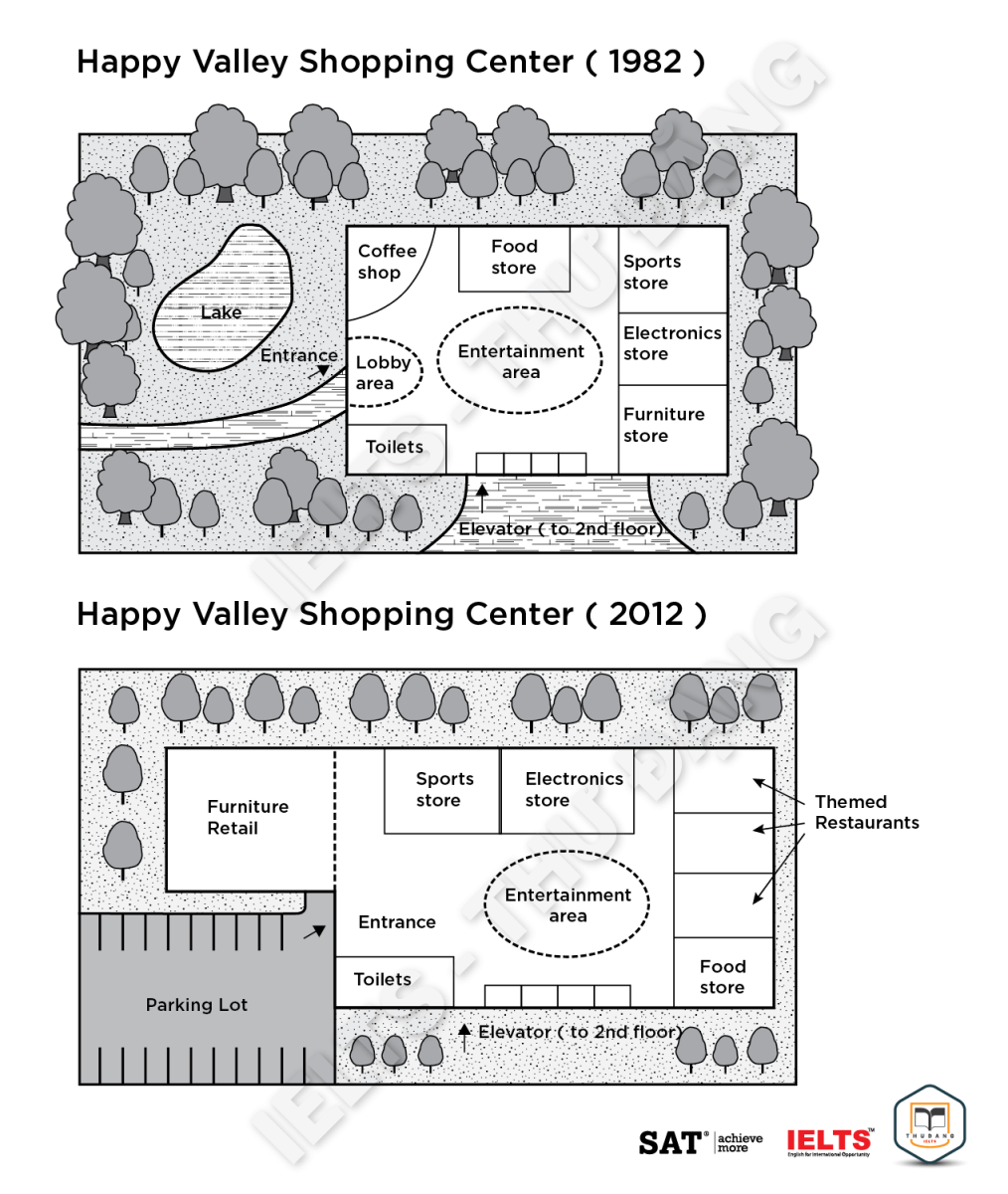 Task 1: The diagrams below show changes in Happy Valley Shopping Centre in 1982 and 2012. Summarize the information by selecting and reporting the main features and make comparisons where relevant.