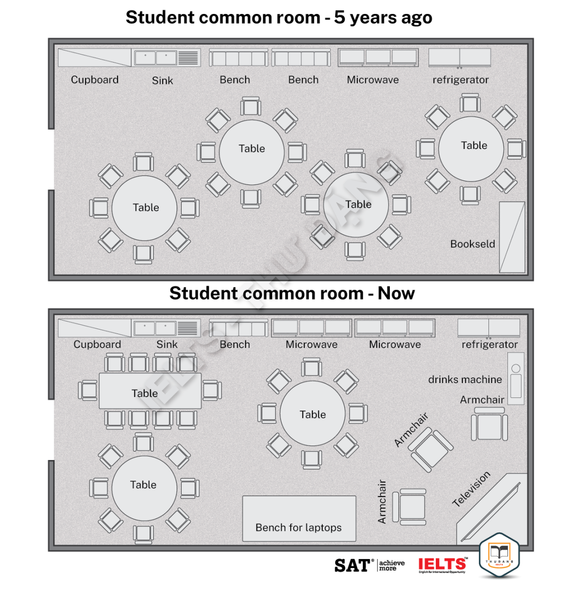 Task 1: The diagrams show changes in a student common room. Summarize the information by selecting and reporting the main features and make comparisons where relevant.