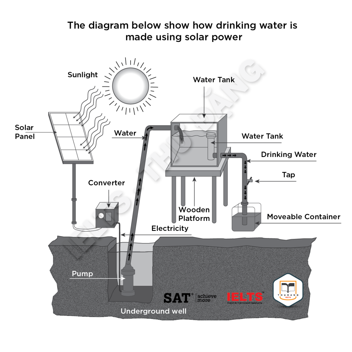 Task 1: The process below shows how drinking water is made using solar power. Summarize the information by selecting and reporting the main features and make comparisons where relevant.