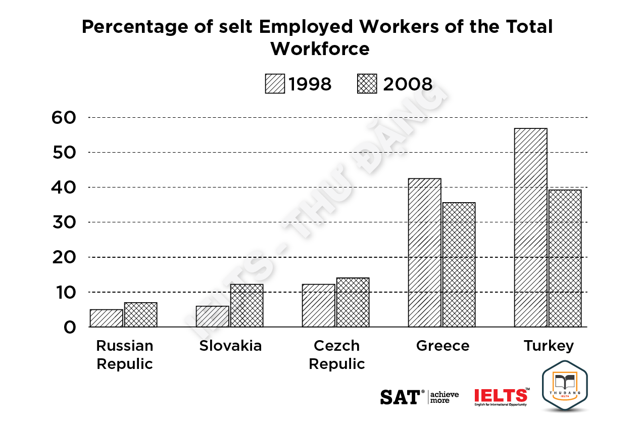 Task 1: The graph below shows the percentage of self-employed workers of the total workforce in five countries in 1998 and 2008. Summarize the information by selecting and reporting the main features and make comparisons where relevant.