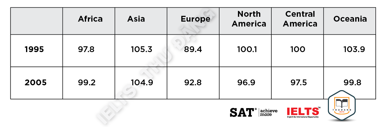 Task 1: The table below shows the population ratio of females per 100 males in six different areas in 1995 and 2005. Summarize the information by selecting and reporting the main features and make comparisons where relevant.
