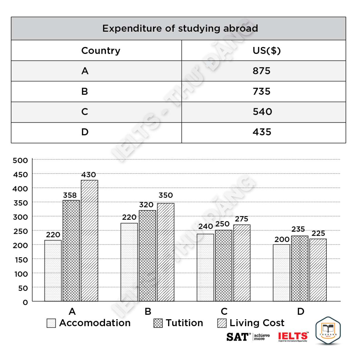 Task 1: The table and the chart below provide a breakdown of the total expenditure and the average amount of money spent by students per week while studying abroad in 4 countries. Summarize the information by selecting and reporting the main features, and make comparisons where relevant.