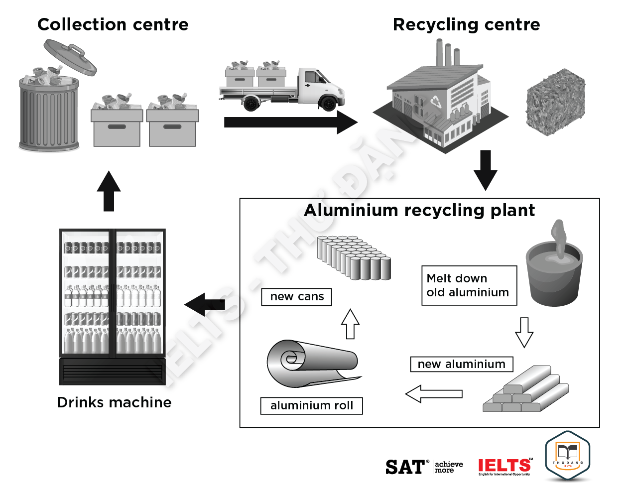 Task 1: The diagram below show the stages in the recycling of aluminum drinks can. Summarize the information by selecting and reporting the main features, and make comparisons where relevant.