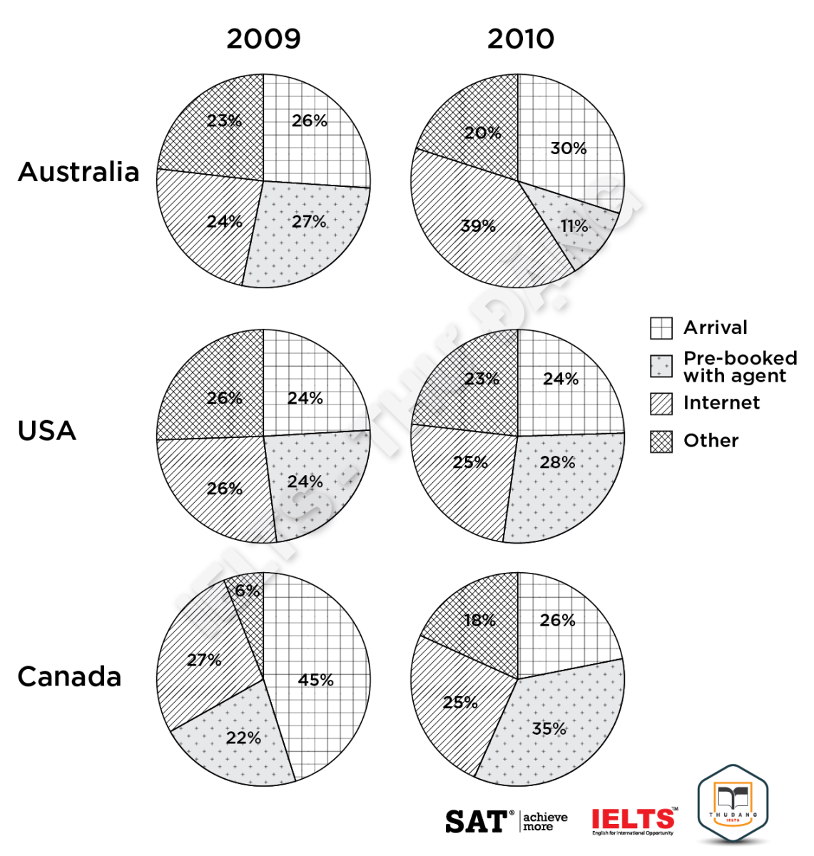 Task 1: The pie charts below show the methods used by international students when booking the online English courses in three different countries in 2009 and 2010. Summarise the information by selecting and reporting the main features, and make comparisons where relevant.